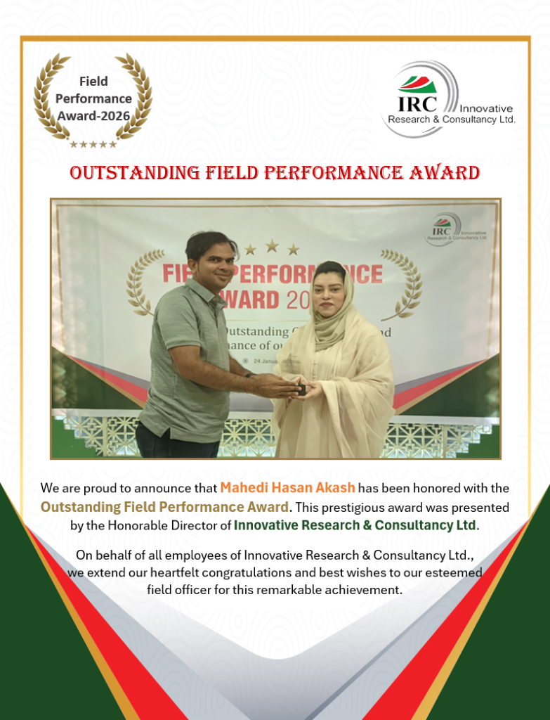 We are proud to announce that Mahedi Hasan Akash has been honoured with the Outstanding Field Performance Award. This prestigious award was presented by the Honorable Director of Innovative Research & Consultancy Ltd.