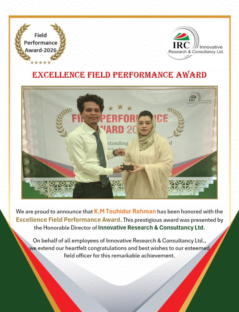 We are proud to announce that K.M Touhidur Rahman has been honoured with the Excellence Field Performance Award. This prestigious award was presented by the Honorable Director of Innovative Research & Consultancy Ltd.
