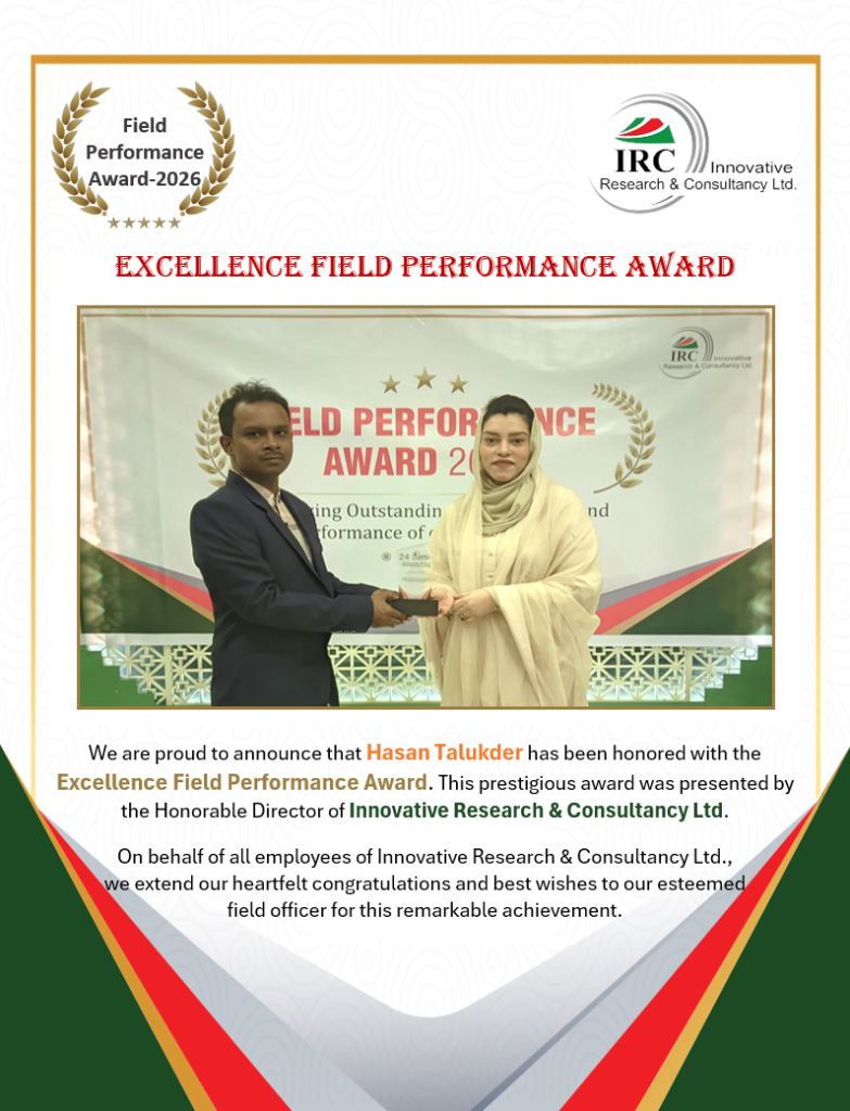 We are proud to announce that Hasan Talukder has been honoured with the Excellence Field Performance Award. This prestigious award was presented by the Honorable Director of Innovative Research & Consultancy Ltd.