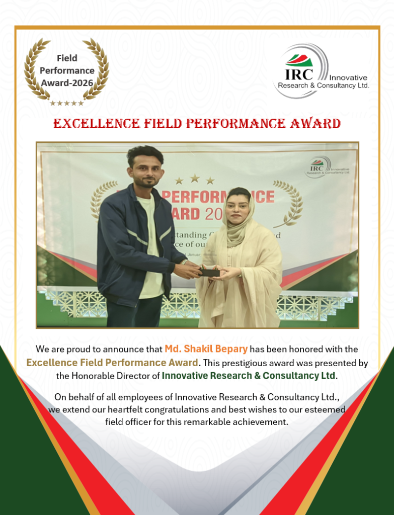 We are proud to announce that Md. Shakil Bepary has been honoured with the Excellence Field Performance Award. This prestigious award was presented by the Honorable Director of Innovative Research & Consultancy Ltd.